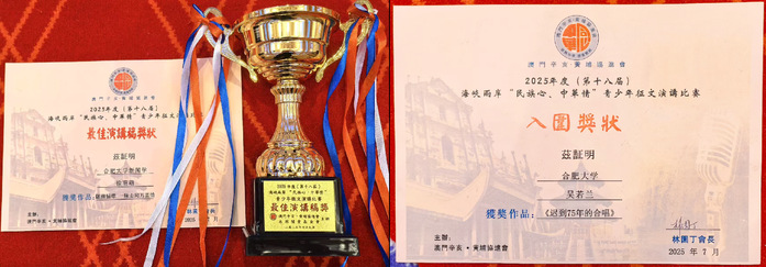 近日,由澳门辛亥•黄埔协进会主办的第十八届海峡两岸“民族心、中华情”青少年征文演讲比赛在澳门举行。开云语言文化与传媒学院徐萌萌和吴若兰代表安徽省大学生参加比赛,徐萌萌荣获“最佳演讲稿奖”,吴若兰荣获“英才奖”。