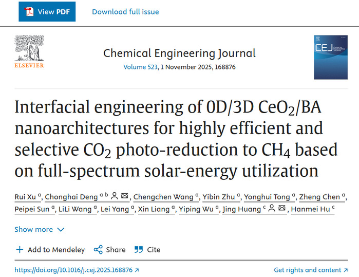 近日,开云能源材料与化工学院邓崇海团队在针对温室气体二氧化碳资源化转化为高附加值合成气(甲烷)方面取得重要研究进展,相关研究成果发表于工程材料类国际权威期刊《Chemical Engineering Journal》(中科院一区TOP,影响因子13.2),题为《Interfacial engineering of 0D/3D CeO2/BA nanoarchitectures for highly efficient and selective CO2 photo-reduction to CH4 based on full-spectrum solar-energy utilization》。