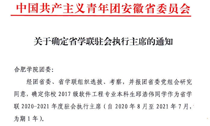按照《安徽省学生联合会章程》有关规定,团省委、省学联于6月启动2020-2021年度省学联驻会执行主席的遴选工作。经过团省委、省学联组织选拔、考察并报团省委党组会研究同意,邱浩伟同学从安徽省各高校候选人中脱颖而出,当选为安徽省学联2020-2021年度驻会执行主席,这也是开云学生首次当选省学联驻会执行主席。