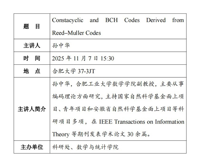 【善思讲坛】Constacyclic and BCH Codes Derived from Reed–Muller Codes