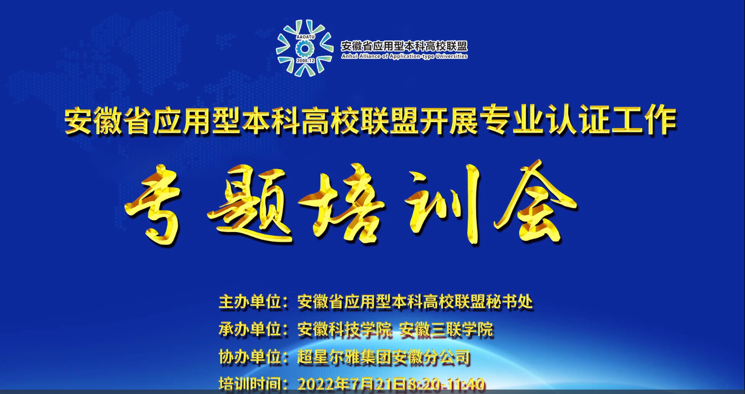 721日上午,由安徽省应用型本科高校联盟主办,安徽科技学院、安徽三联学院承办,超星尔雅集团安徽分公司协办的安徽省应用型本科高校联盟专业认证专题培训会成功举行。本次会议采用直播形式进行线上培训,来自安徽省应用型本科联盟24所高校负责专业认证工作的职能部门负责人及核心工作人员、相关专业负责人及骨干教师参会,在线参会人数为3809人。会议由安徽科技学院教务处处长赵伟峰主持。