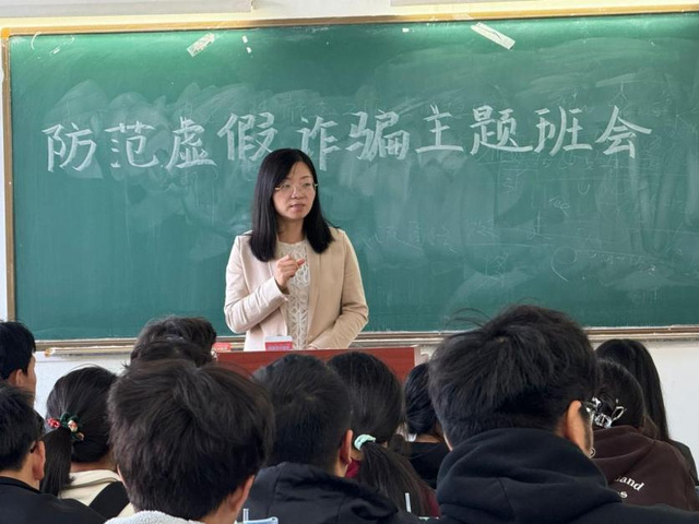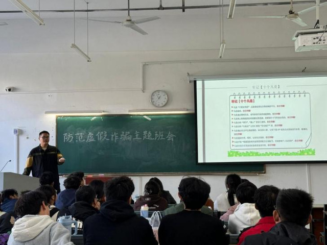 班会伊始,苗冰涛老师以一段电信网络诈骗的视频作为开场,生动直观地引出了本次会议的主题。接着,他详细列举了十种常见的电信网络诈骗手段,并强调六个防诈骗策略。他希望同学们能将防诈骗知识牢记于心,付诸于行,拥抱真实、美好的生活。