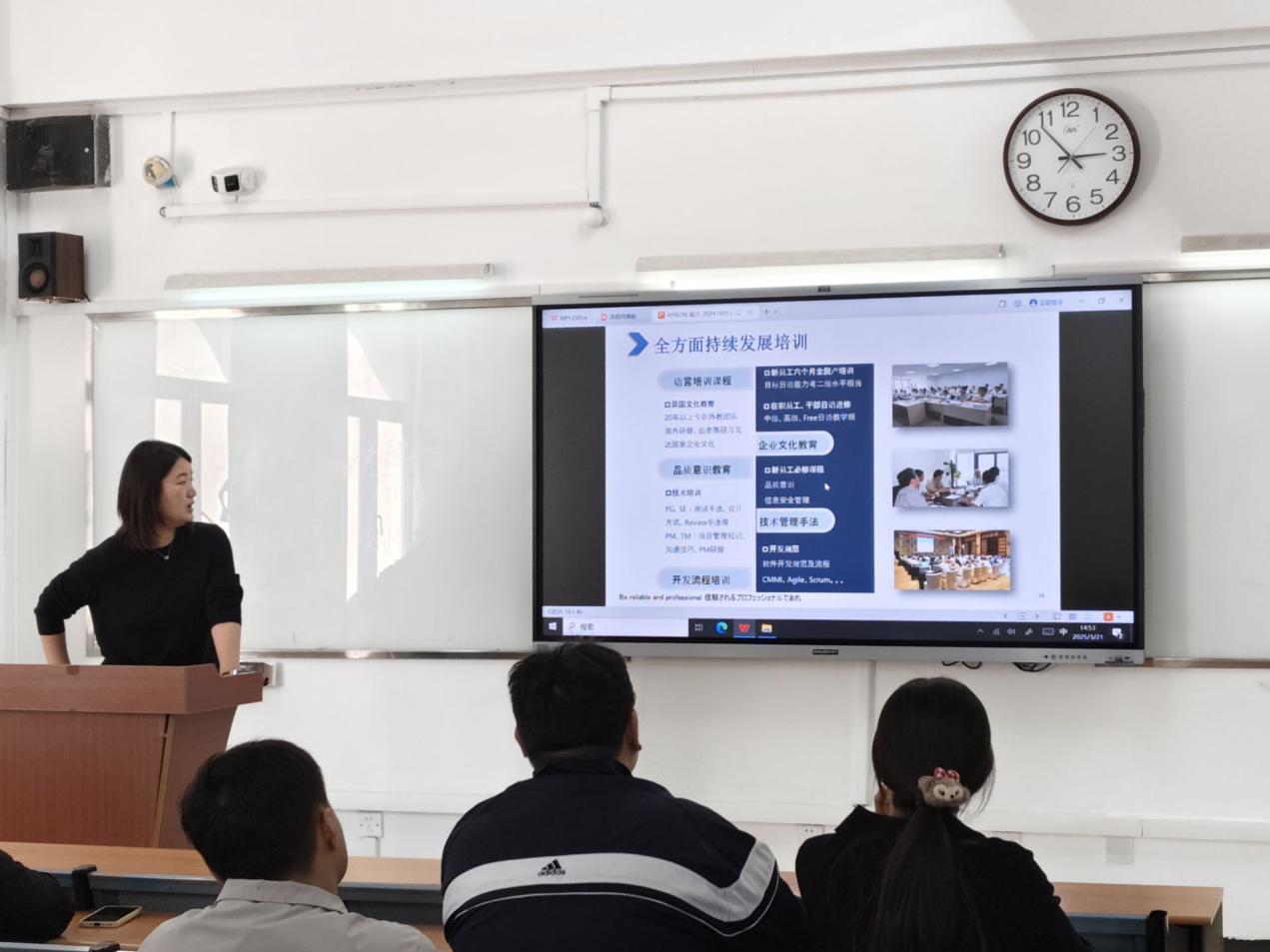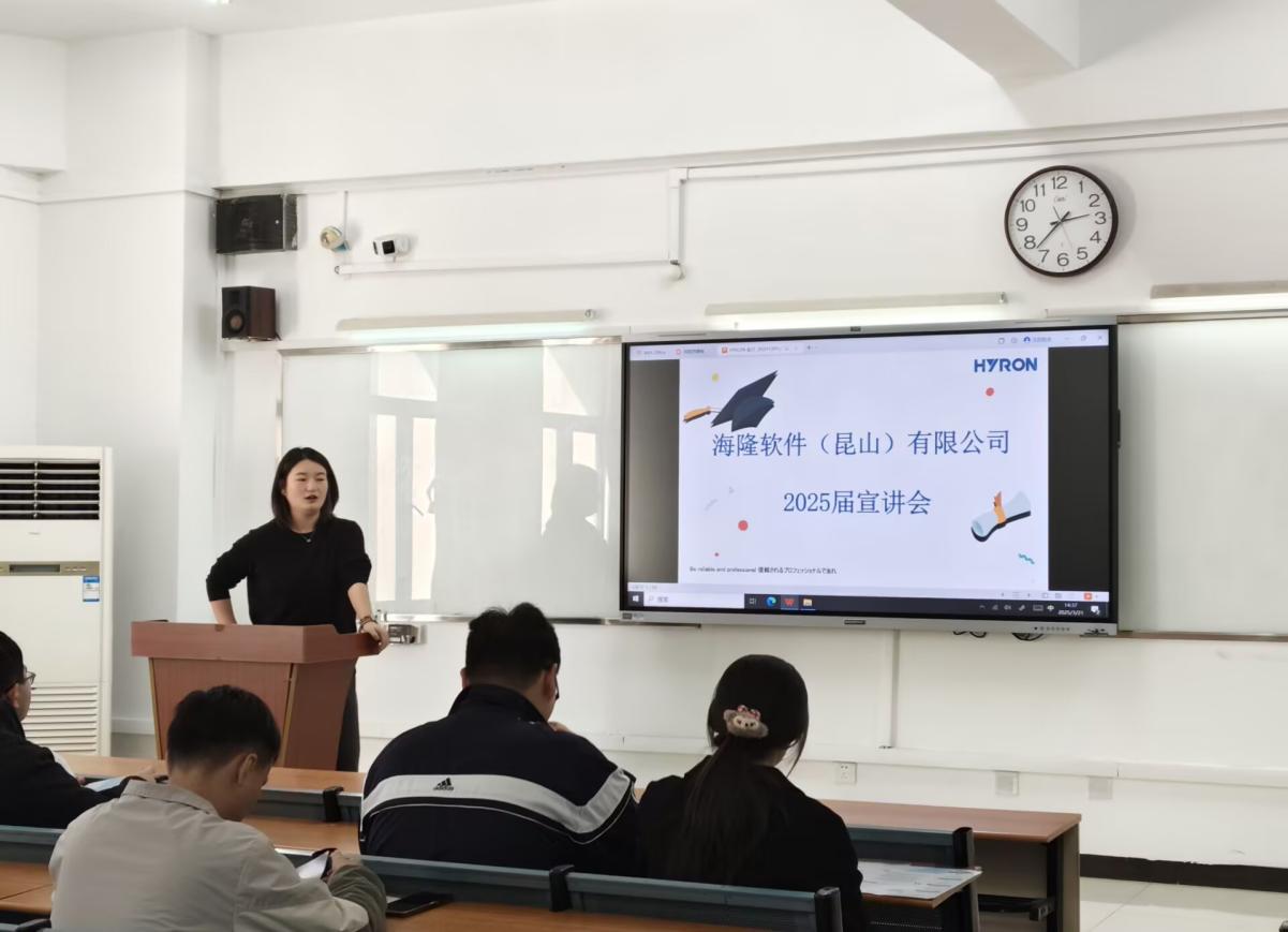 在宣讲过程中,海隆软件(昆山)有限公司的HR向在场的求职学生全方位展示了公司的企业文化、发展历程、业务布局、雄厚的技术实力以及明晰的未来发展规划。考虑到毕业生即将踏入社会,公司着重对招聘岗位、薪资福利体系、职业晋升通道等关键内容进行了详细解读,让同学们收获颇丰。
