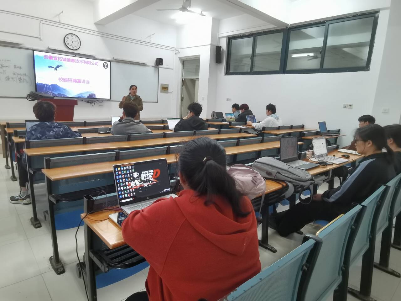 4月 19日下午,安徽拓诚科技有限公司在kaiyun开云官方网站36栋204教室举行了校园招聘活动,众多kaiyun开云官方网站的在校大学生踊跃参与。