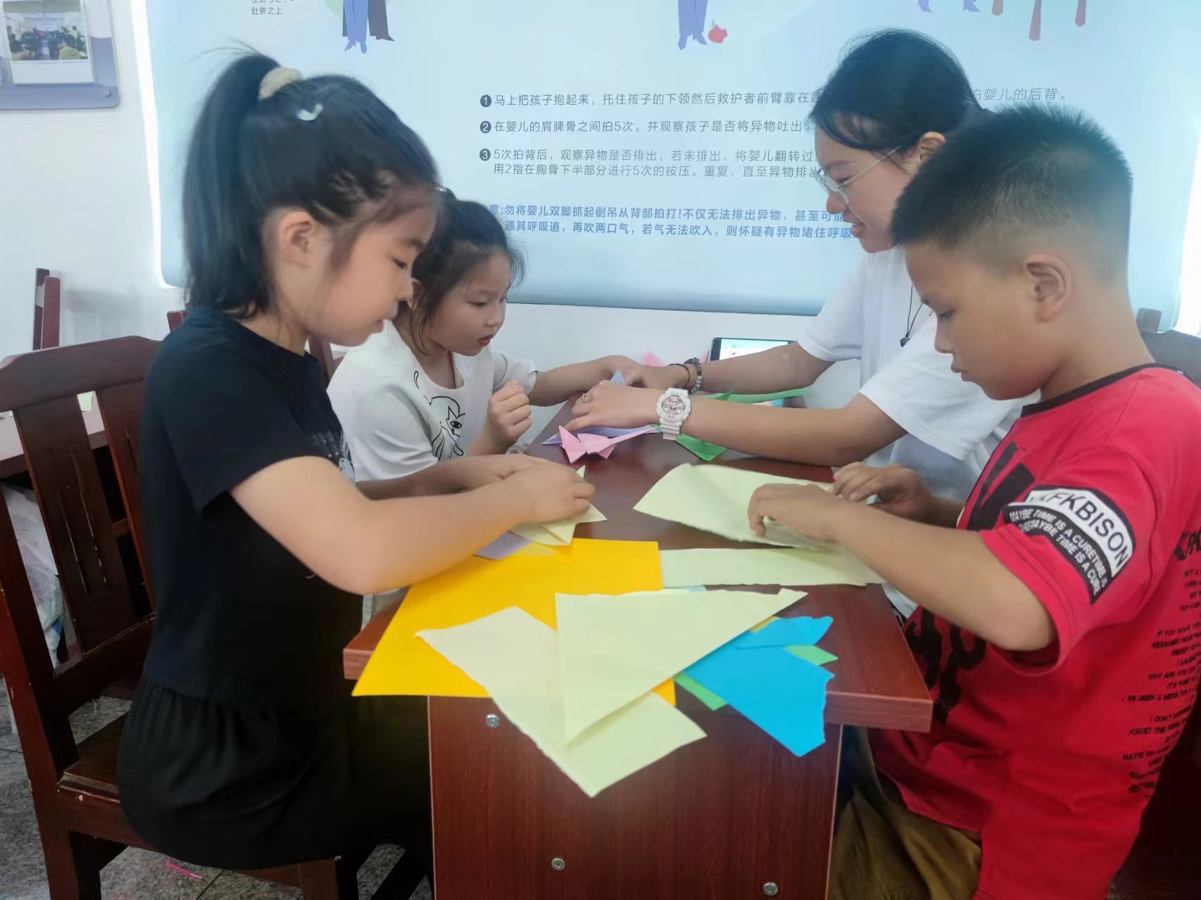 7月18日上午,同学们又去往五龙社区开展垃圾分类主题的公益课堂。同学们耐心地指导每一个孩子进行折纸,丰富了儿童的课余生活。