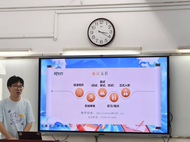 参加本次招聘宣讲会的是新东方合肥学校的佘经理,经理向在座求职学生全面介绍了公司的企业文化、发展历程、业务布局、技术实力以及未来发展规划。特别是针对即将步入社会的毕业生们,公司详细介绍了招聘岗位、薪资福利、职业晋升路径等大家关心的内容,让在场学生受益匪浅。
