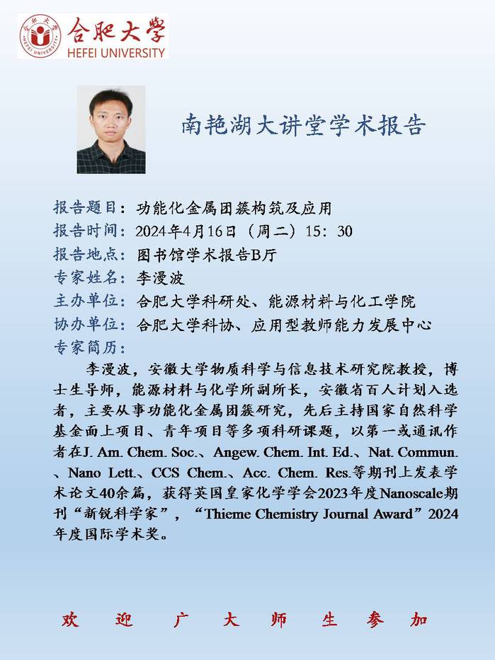 【南艳湖大讲堂】功能化金属团簇构筑及应用