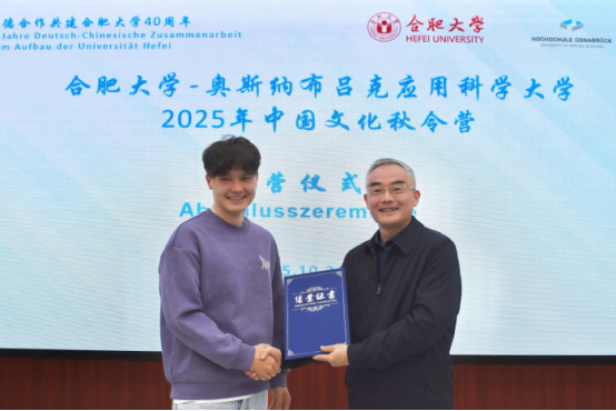 Recently, the 2025 Chinese Cultural Autumn Camp co-hosted by Hefei University(HFU) and Osnabruck University of Applied Sciences(OUA) came to a successful conclusion. Ren Yong, President of HFU and Wu Pingchuan, Chair of the University Council, attended the opening and closing ceremonies respectively.