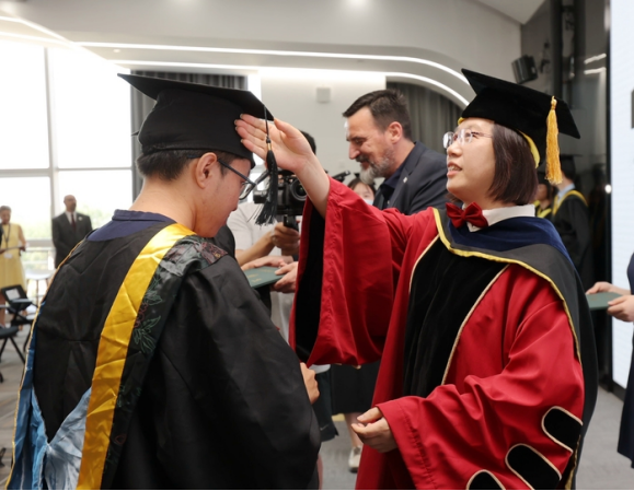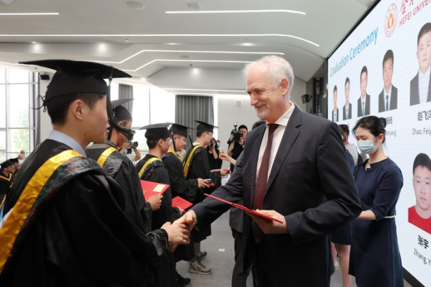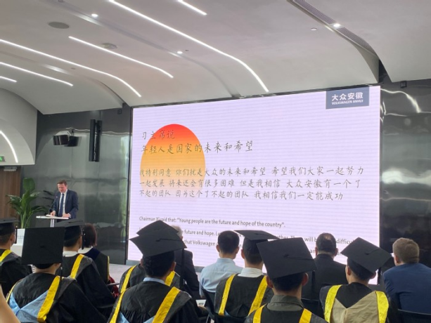 The morning of June 16, 2022 sees the graduation ceremony at Volkswagen Anhui of the first batch of “Seed Engineers” jointly trained by HFU and Volkswagen Group China. Wu Chunmei, HFU President, attends the ceremony together with Mr. Jens Pfitzinger, Volkswagen Group Executive Vice-president and Dr. Gabardi, CEO of Volkswagen Anhui.