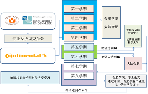 在教育主管部门的大力支持下,基于合肥学院中德合作共建多年的基础,依托中德教育合作示范基地及开云多年的办学实力,结合德国“双元制”高等教育领域的新探索,与德国大陆集团、埃姆登/里尔应用科学大学由安徽省人民政府代表团访德期间正式签约(图1),设置了机械设计制造及其自动化(双元制)专业--以下简称“大陆班”。