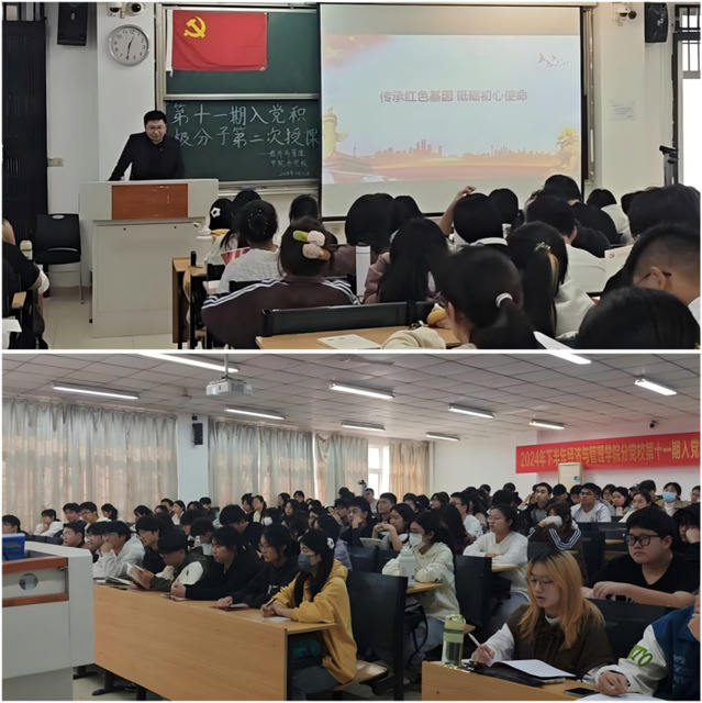 2024年11月12日中午,经济与管理学院分党校第十一期入党积极分子培训班第二课于一期4栋107教室进行。经济与管理学院组织员、金融学学生党支部书记陈维浩担任主讲人。经济与管理学院第十一期入党积极分子培训班全体学员参加学习。 陈维浩详细讲述了中国共产党在新民主主义革命时期、社会主义革命和建设时期以及改革开放和社会主义现代化建设新时期、中国特色社会主义新时代四个时期,团结带领中国人民砥砺奋进的光辉历程。陈维浩强调,各位入党积极分子应始终坚持共产党员的初心和使命,坚定自己的理想信念,树立正确的价值观念,要具备社会责任感和奉献精神。