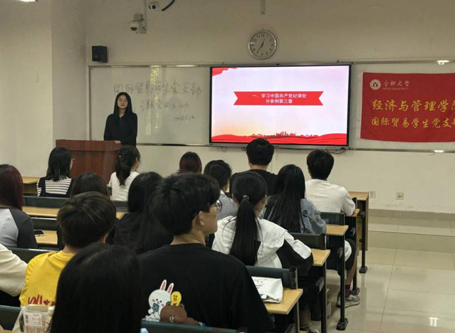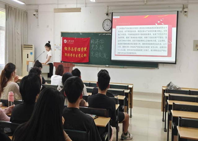 为激发入党积极分子的爱国热情,强化服务担当意识,各党支部于5月中旬联系第十期各专业的入党积极分子分别开展了内容丰富的主题党日活动。 工商管理学生党支部组织入党积极分子交流研讨了《中国共产党纪律处分条例》,入党积极分子就《条例》中的内容进行了分享与交流。会计学学生党支部负责人为入党积极分子详细介绍了《条例》的背景与内容,强调了党组织纪律的重要性。经济学学生党支部组织入党积极分子集中观看了介绍党章党规的相关视频,并学习了《条例》相关内容。国际贸易学生党支部组织入党积极分子深入学习了《条例》第三章的内容。金融学学生党支部负责人带领入党积极分子学习了《条例》第一章总则的相关内容。物流与供应链学生党支部带领入党积极分子学习了《条例》新增、修改的重点条文,随后开展了党员先锋小课堂活动。研究生党支部重点对《条例》中违纪与纪律处分、纪律处分运用规则等内容进行了学习。 此次培训,加强了入党积极分子与正式党员之间的交流,通过实践活动的形式提升入党积极分子的党性修养和实践能力,对于进一步加强党员教育管理、提升党员队伍质量具有重要意义。 (经济与管理学院撰稿人:耿权龙 初审:王晨森 复审:余宏强终审:倪泽强)