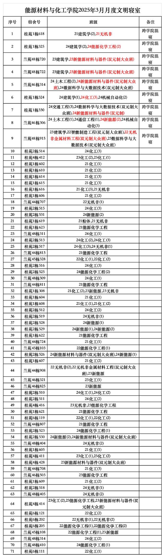根据《kaiyun开云官方网站文明宿舍评选办法》相关规定,遵循公开、公平、公正的原则,经学校和学院检查评分,现将能源材料与化工学院3月文明宿舍名单进行公示,接受全院师生监督。如有异议,请在公示期间以书面或电话形式向院纪委或院学工办反映。(拟获奖名单见下图)。公示日期为2025年4月10日至2025年4月17日。