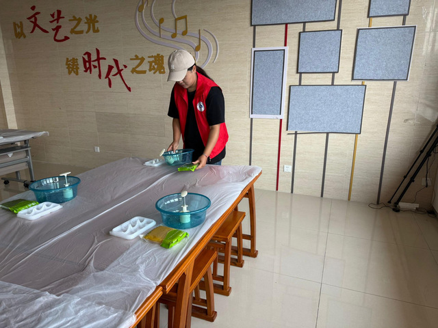 首先,志愿者们在朝霞居委会教室内准备着活动所需要用到的物品,例如橡皮泥,制作工具,盆子等,同时为避免环境脏乱,帮活动场所的桌子铺好了桌布,为本次活动顺利进行提供了良好的开场基础。