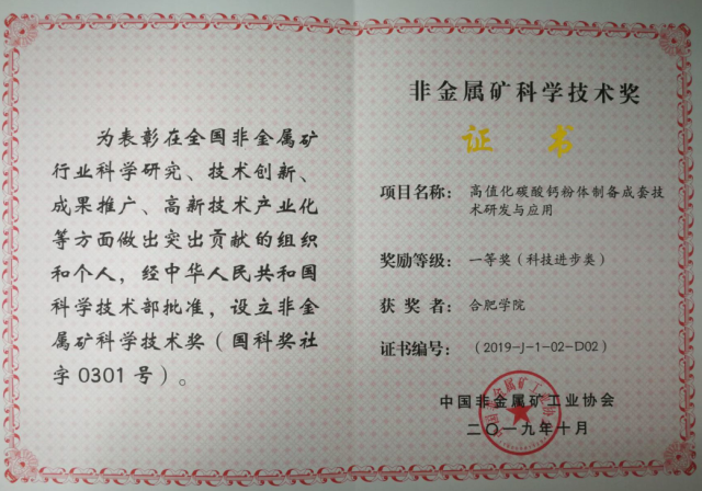 据了解,该奖项是中国非金属矿行业的最高奖项,是经科学技术部批准的社会力量设立的科学技术奖(国科奖社字0301号),主要是为表彰在全国非金属矿行业科学研究、技术创新、成果推广、高新技术产业化等方面做出突出贡献的组织和个人。另外,秦广超老师团队于2019年9月6日在浙江建德召开的全国碳酸钙行业年会上,喜获2项全国碳酸钙行业创新奖。