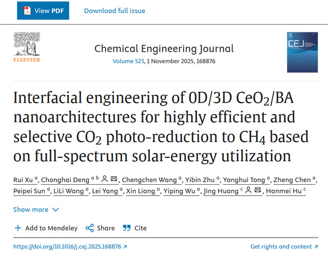 太阳能驱动的光催化能源生成技术为开发可持续清洁能源资源以及实现碳中和提供了极具前景的途径。近日,我院邓崇海教授课题组在针对温室气体二氧化碳资源化转化为高附加值合成气(甲烷)方面取得重要研究进展,相关研究成果发表于工程材料类国际权威期刊《Chemical Engineering Journal》(中科院一区TOP,影响因子13.2),题为《Interfacial engineering of 0D/3D CeO2/BA nanoarchitectures for highly efficient and selective CO2 photo-reduction to CH4 based on full-spectrum solar-energy utilization》。