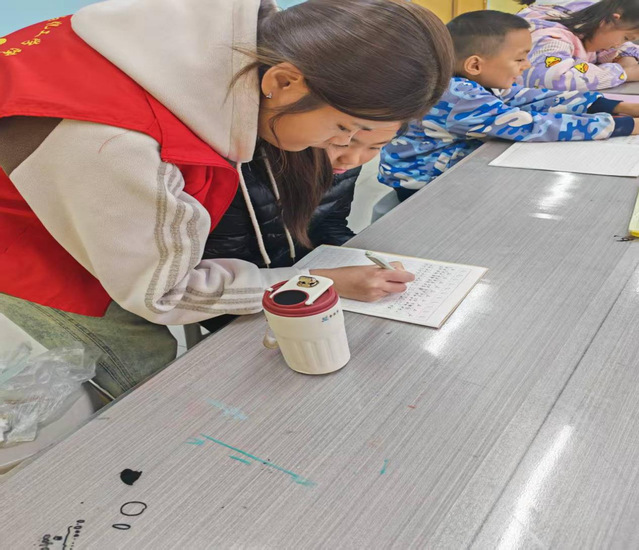 上午9时,书法课堂的志愿服务率先拉开帷幕。两名志愿者早早抵达现场,协助居委会老师做好课前筹备:引导孩子们有序签到、细致分发书法教材与笔墨工具,用耐心与细心为课堂筑牢有序开端。课堂上,他们化身“辅助小老师”,轻声提醒课堂纪律,俯身解答孩子们关于执笔、运笔的疑问,用温柔鼓励化解初学的生涩,让墨香氤氲的课堂洋溢着轻松愉悦的学习氛围,助力书法教学顺畅推进。