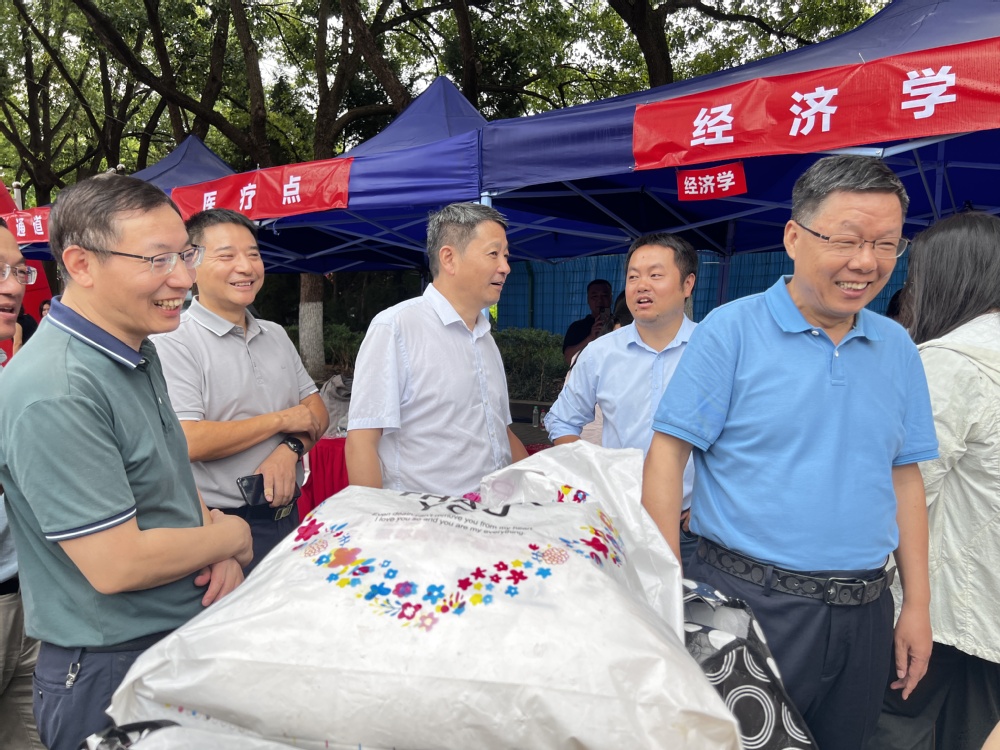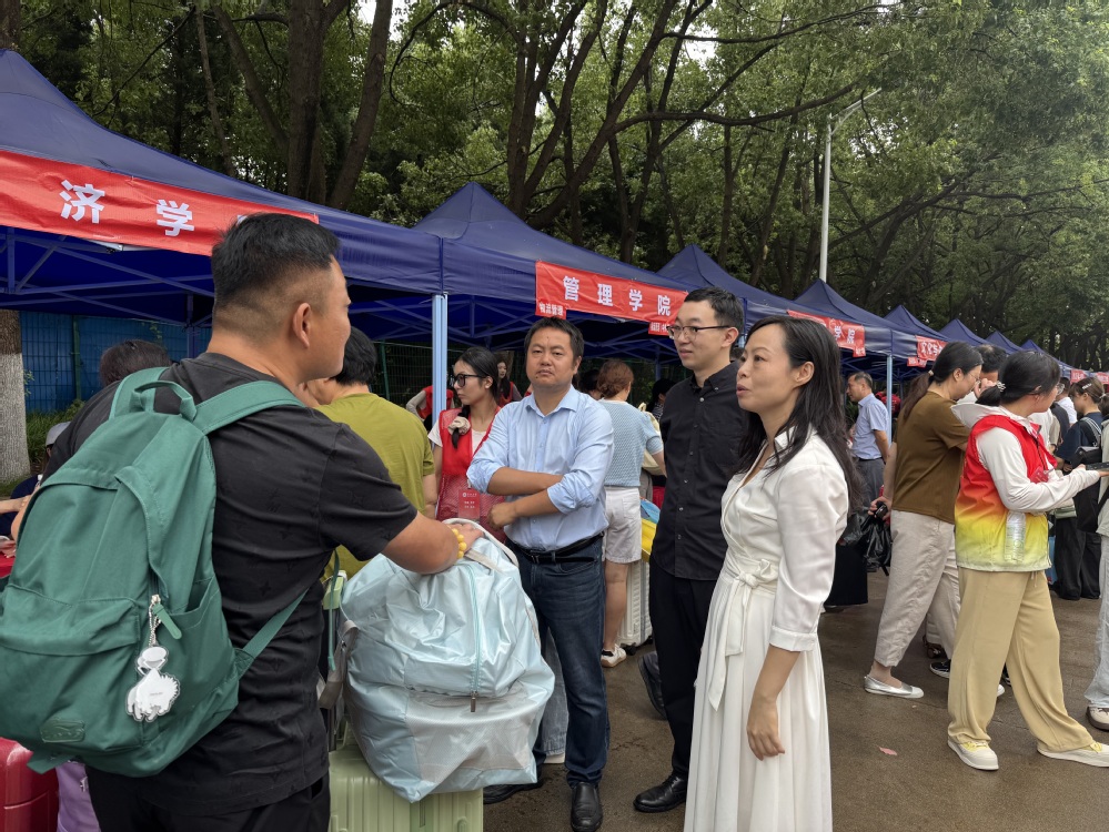 9月9日清晨,迎新工作正式启动。为方便新生报到入住,校园内随处可见温馨的欢迎标语和清晰的指引牌。经济学院的志愿者们在竹苑和香怡社区设置服务点,身穿统一的红色马甲,佩戴工作证,为新生提供行李搬运、路线指引、报到流程讲解等“一站式”服务,用热情与耐心驱散新生初来乍到的陌生感。同时,学院领导亲临迎新现场开展慰问工作,他们的到来与关怀,不仅体现了对迎新工作的高度重视,更让坚守岗位的工作人员与初来乍到的新同学倍感温暖、深受鼓舞。