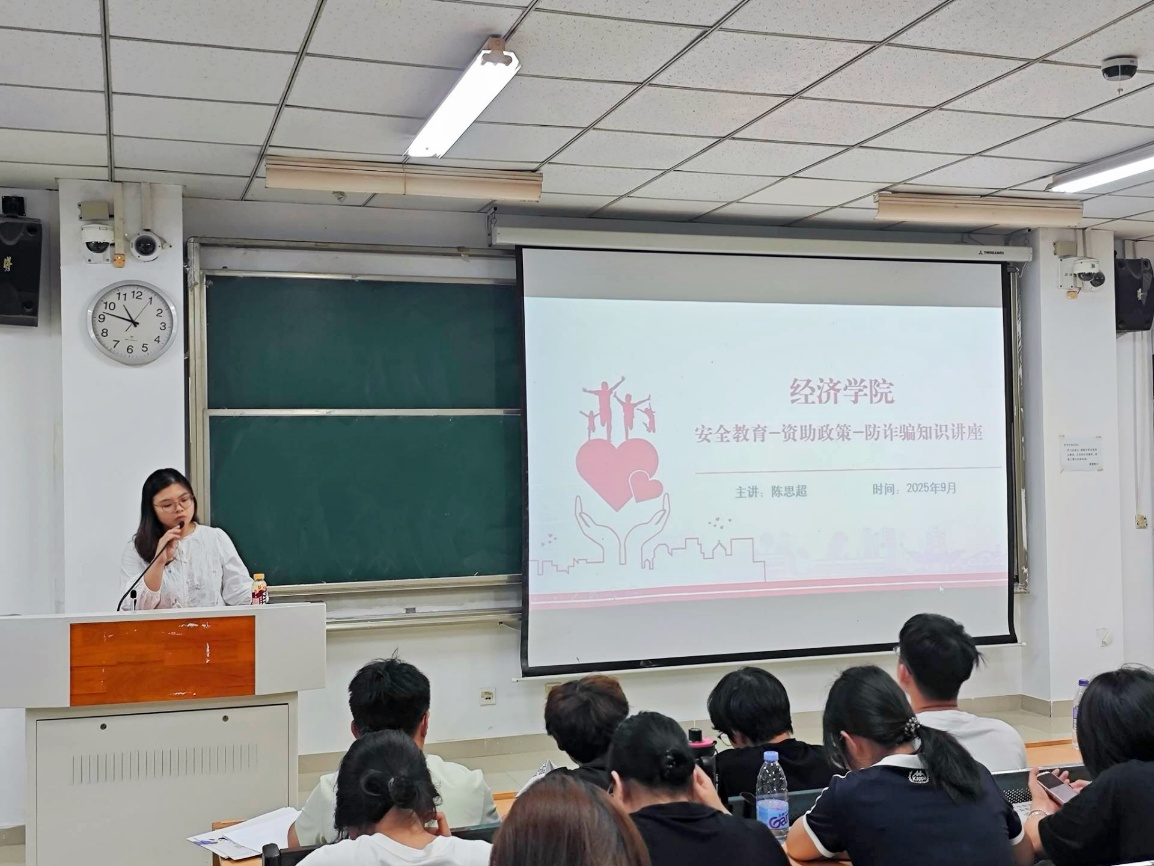 2025年9月13日,经济学院在教学楼4-107和5-101教室举办了“安全教育—资助政策—防诈骗知识”专题讲座。本次讲座由学院资助负责老师陈思超主讲,2025级全体新生参会,内容涵盖校园安全、资助政策解读与防诈骗指南三大核心板块。