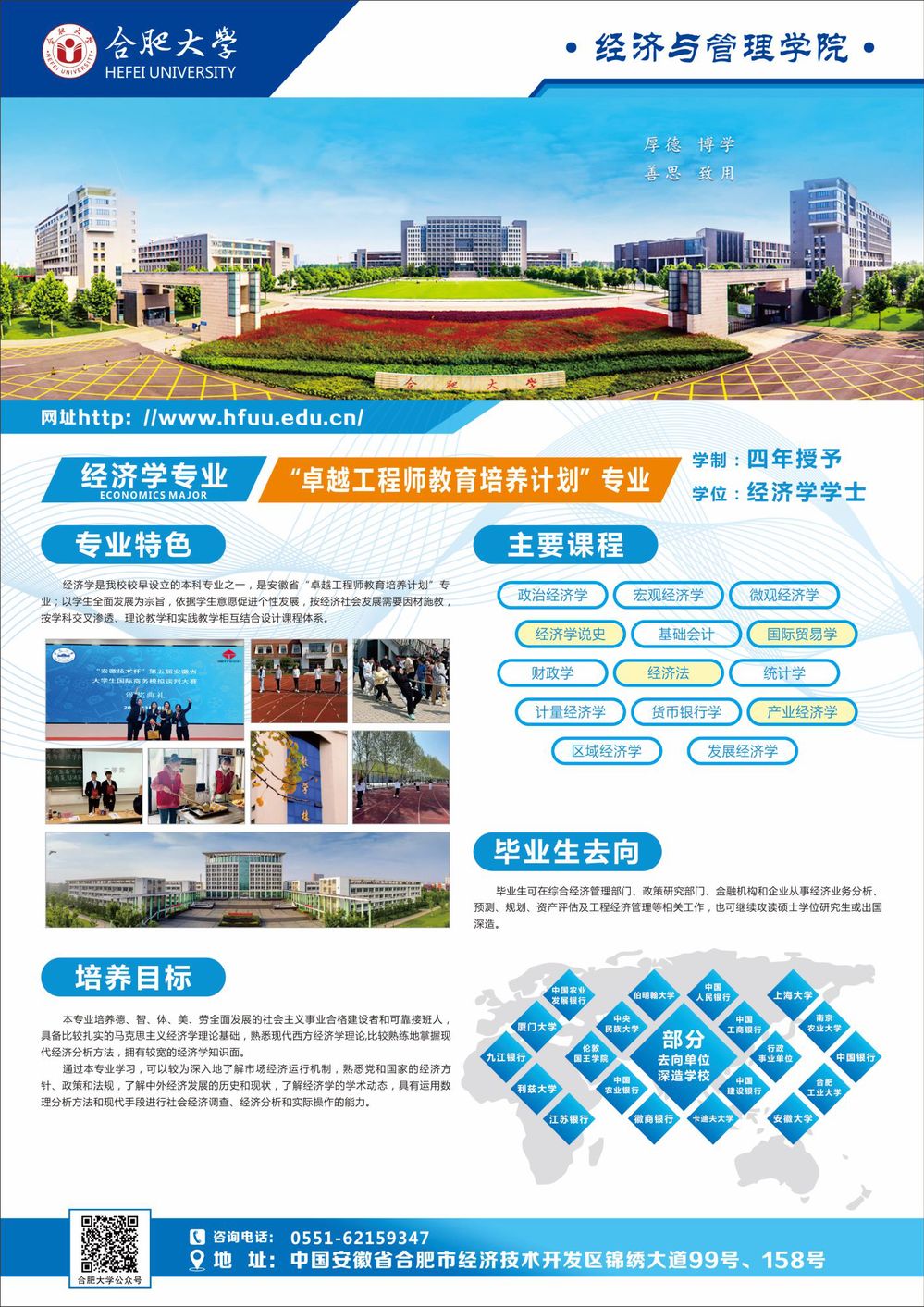 经济学(本科) 咨询电话:0551-62159347 省级“卓越经济工程师教育培养计划”专业 学 制:四年 授予学位:经济学学士 培养目标及特色:本专业培养德、智、体、美、劳全面发展,具备马克思主义经济学理论基础,熟悉现代西方经济学理论,熟练掌握现代经济分析方法,知识面较宽,具有向经济学相关领域扩展渗透能力的专业类人才;同时,根据开云地方性、应用型、国际化的办学定位,注重对学生进行理论教学与实践锻炼同步结合,使学生具有国际宏观视野,并熟悉国内外经济现状,能够理论联系实际,同时具备较强适应性能力的高层次应用型人才。本专业注重培养理论基础扎实、逻辑思维清晰、实践能力较强的复合型人才。 毕业生发展方向:毕业生可在政府部门、政策研究部门、金融部门和相关企业从事经济分析、预测、规划和经济管理等相关工作;也可继续攻读硕士学位研究生或出国深造。