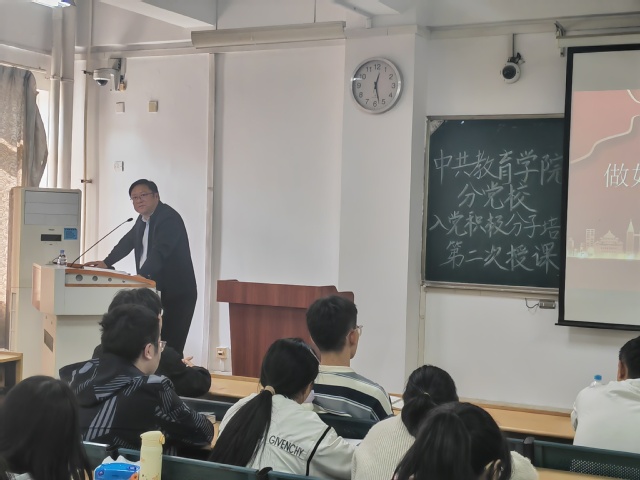 为深入贯彻学习习近平新时代中国特色社会主义思想和党的二十届三中全会精神,深化入党积极分子对意识形态工作的认识,加强意识形态领域的教育引导,11月7日,教育学院分党校举行入党积极分子培训班党课第二讲,主题为“坚定不移做好新时代意识形态工作”,校党委委员、宣传部统战部部长贾峰应邀讲授专题党课。