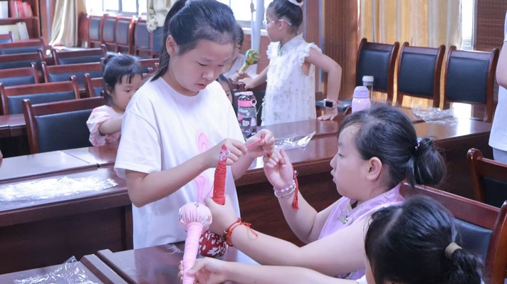课堂尾声,孩子们将亲手制作的艾草锤送给街道打扫工人、保安叔叔及社区老人,用这份带着温度的手工作品传递敬意与关怀,让传统节日的温情与善意在互动中延续。