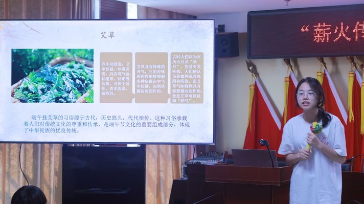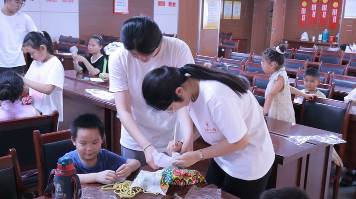 “大家小心手中的艾草包不要弄洒了。”鲁丹妮老师一边叮嘱孩子们一边手托艾草锤模型:从艾草锤头部的草包到根部的布袋,都体现着对古代传统文化的传承与发展。制作环节气氛热烈,团队成员向孩子们分发艾草锤制作的材料。在团队成员们的帮助下,孩子们用双手将棉布与艾草包逐一包裹起来,一个个精美的艾草锤出现在孩子们的手中。孩子们将制作好的艾草锤高高举起,与他们洋溢着的笑脸相互映衬。