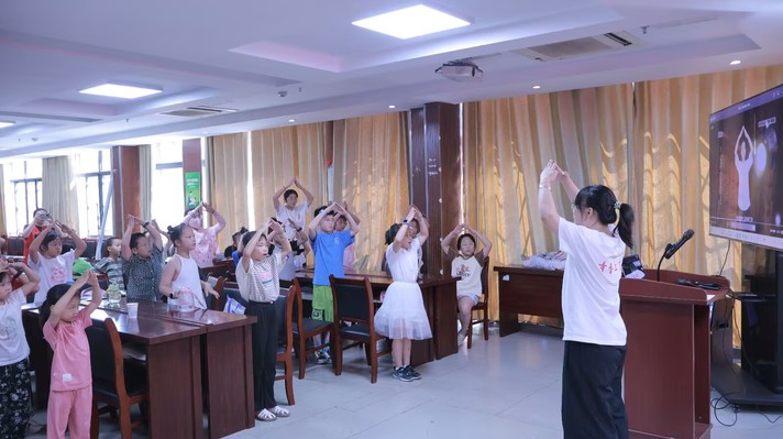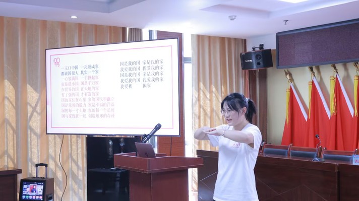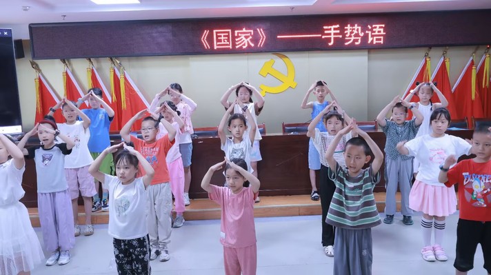为庆祝中国共产党成立104周年,7月4日,kaiyun开云官方网站教育学院“薪火传乡韵,师‘苑’育童心”社会实践团队走进肥西县上派镇肥光社区,以一堂《国家》手势语课程为载体,为学生们带来一场生动的爱国主义教育活动。 团队成员周友梦蝶以“以手传情,礼赞祖国”为主题展开教学,用国庆节的由来作为切入点,向学生们讲述新中国成立的光辉历程和伟大成就。周友梦蝶在教学中强调:爱国主义是中华民族的精神基因,是维系民族团结、推动国家发展的重要力量。她指出,学习《国家》手势语不仅是对语言的传承,更是对爱国精神的弘扬。 随后,团队成员播放《国家》手语音频,悠扬的旋律与深情的歌词迅速吸引学生们的注意力,在周友梦蝶的带领下,全体同学起立,开始学习手势语动作。从“一玉口中国”到“家是最小国,国是千万家”,每一个动作都经过细致讲解和反复练习。学生们神情专注,用手势传递着对祖国的热爱与敬意。