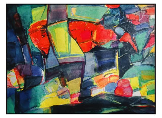 第九届安徽省美术大展水彩.粉画作品展开幕式在滁州学院举办 纸本(水性材料)绘画作品《青绿锦色》以青绿为主色调,呼应中国传统青绿山水画的色彩体系。“锦色”指绚丽且富有美感的颜色,泛指具有文化象征意义的传统颜色,象征繁荣、和谐和美好。作品运用简约概括的现代主义表现手法,强调主观感受,造型夸张、变形、简化。以西画的材料融入中国传统绘画的笔墨精神,注重表现绘画的“书写性”。通过热烈奔放的色彩与笔触体现出了独特的艺术审美视角,凸现了对当代艺术中水性材料绘画本体语言的积极探索。作品借生活中温情的角落融入了设计思想,取舍有度,大胆运用色块分割,色彩对比变换的节奏使整个画面呈现一种超脱现实又华丽奇幻的审美特征,具有强烈的视觉冲击力与艺术性。