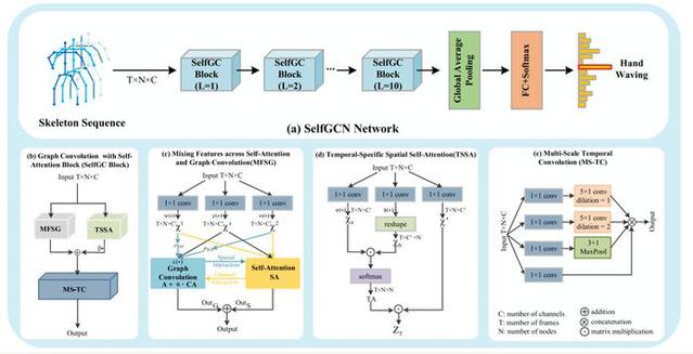 为此,研究团队提出了SelfGCN模型,该方法基于图卷积网络构建人体骨架的拓扑结构,并引入自注意力机制,以自适应地调整关节节点的重要性权重,从而更精准地捕捉动作特征。这一研究工作为基于图结构数据的人体动作识别提供了新的思路,有助于进一步理解和优化人体运动特征的建模方法。