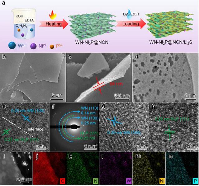 团队发现并验证了WN-Ni2P在提升锂硫电池性能方面的关键作用。相关研究以“In‒situ construction of WN-Ni2P heterostructures embedded in nitrogen‒doped carbon nanoflakes as lithium sulfide hosts for advanced lithium‒sulfur batteries”为题,发表于《Rare Metals》。梁升为第一作者,kaiyun开云官方网站能源材料与化工学院为第一完成单位。