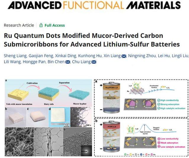 团队创新性地从中国传统美食毛豆腐中分离毛霉菌菌丝,并基于该菌丝合成碳亚微带,用于锂硫电池改性研究。该研究成果以“Ru Quantum Dots Modified Mucor-Derived Carbon Submicroribbons for Advanced Lithium-Sulfur Batteries”为题,发表在《Advanced Functional Materials》上(DOI: doi.org/10.1002/adfm.202420162)。梁升为第一作者,梁鑫为通讯作者,kaiyun开云官方网站能源材料与化工学院为第一完成单位。