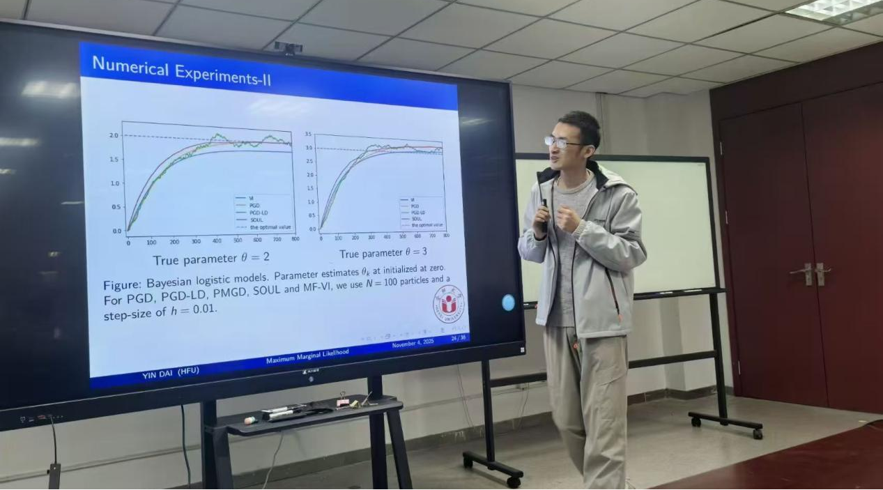 在报告会上,代银博士作了题为“经验贝叶斯框架下的最大边际似然估计:在偏微分方程反问题中的应用”的学术报告。该报告提出新型相互作用粒子朗之万算法,聚焦潜变量模型参数估计与偏微分方程(PDE)反问题两大核心任务。该算法可高效实现最大边际似然估计并拓展至随机梯度场景,逻辑回归数值实验验证了其优异性能。