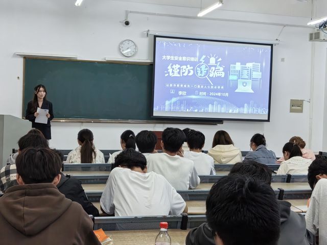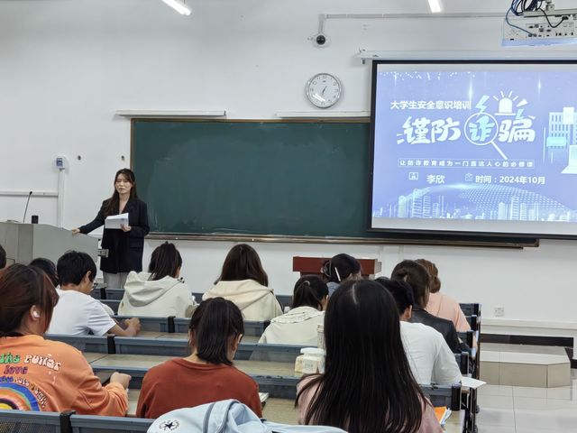 首先李欣向同学们讲述了开学校园诈骗的频发以及一些典型事例,并向同学们讲述了诈骗的各种类型,像网上刷单、校园贷、或者是购物诈骗,诈骗分子以低价诱惑学生却在付款后消失无踪、又或是兼职诈骗,利用学生想赚取生活费的心理,骗取所谓的“押金”“手续费”,并且提醒所有新生要时刻保持防范意识,对不确定的信息要经过多方核实和确认,告诫同学不要轻信陌生人的话时刻保持警惕。随后李欣向同学们讲述了如何辨别诈骗电话和诈骗信息,并告诉同学预防诈骗的方法和措施,保护学生的财产安全,李欣提醒大一新生遇到可疑情况一定要与辅导员、家长或同学商量,或者直接向相关部门反映。