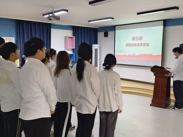 新团员代表张宗宇发言,他表示将严格要求自己,努力学习,提升自我,以实际行动践行入团初心。优秀老团员代表肖一瑶也在仪式上发言,他分享了在团内的成长经历和收获,鼓励新团员积极参与团组织活动,培养社会责任感和团队协作精神,他期待与新团员们共同成长进步。紧接着,杨林向新团员们表示祝贺,并提出殷切期望,希望新团员们能够认识到身份上的转变,坚定自身理想信念,积极学习党的科学理论知识,胸怀理想、增长才干,在新时代展现新作为。