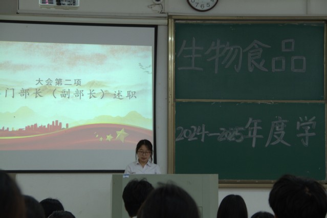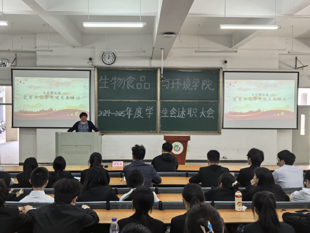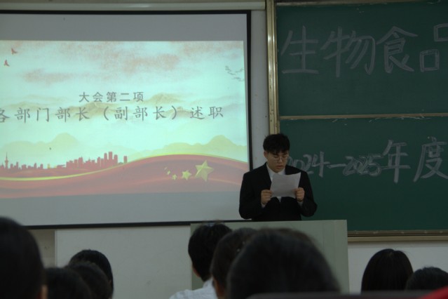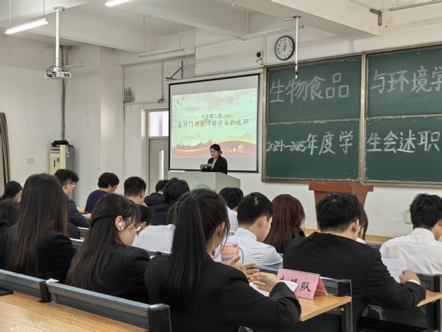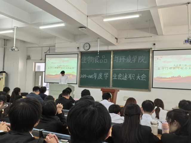 2025年4月23日12点30分,生物食品环境学院2024-2025年度学生会述职大会于生化楼一阶梯教室顺利召开,生物食品与环境学院党委书记李秀娟,院团委负责人杨林以及全体学生会成员参与。