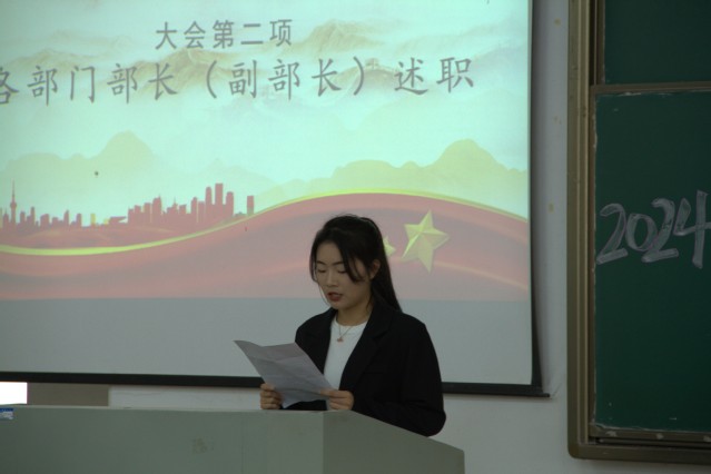 大会伊始,由主持人旷家昱上前致辞,宣布大会开始。大会第一项,全体起立,奏唱共青团团歌,在一声声庄严的团歌渲染下,全体成员不禁面容庄重,共唱共青团团歌。大会第二项,由各部门部长述职,各部长讲述了各自部门的工作成果、不足之处、未来规划以及感谢寄言。大会第三项,由主席团代表成晓超进行全面述职。在过去的一年里,学生会秉持“全心全意为同学服务”的宗旨,扎实推进各项工作,丰富同学们课余生活,展现了生会积极进取、追求卓越的决心。大会第四项,院团委负责人杨林对学生会的工作做出指导,希望各部门充分发挥学生组织的示范引领作用,为学校发展和同学成长贡献更多青春力量。大会最后一项,李秀娟做总结讲话。她对学生会成员的辛勤付出给予高度赞扬,强调学生会要始终坚持正确的政治方向,并结合自身经验希望学生会以此次述职大会为契机,总结经验、正视不足,加强自身建设。