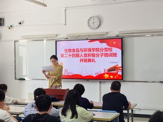 20255121230分,生物食品与环境学院分党校入党积极分子培训班开学典礼在生-214教室举行,由培训班班主任赵暮雨主持,院党委书记李秀娟,院党委副书记、副院长(主持工作)阮班锋,院党委副书记晋松以及全体入党积极分子参与。