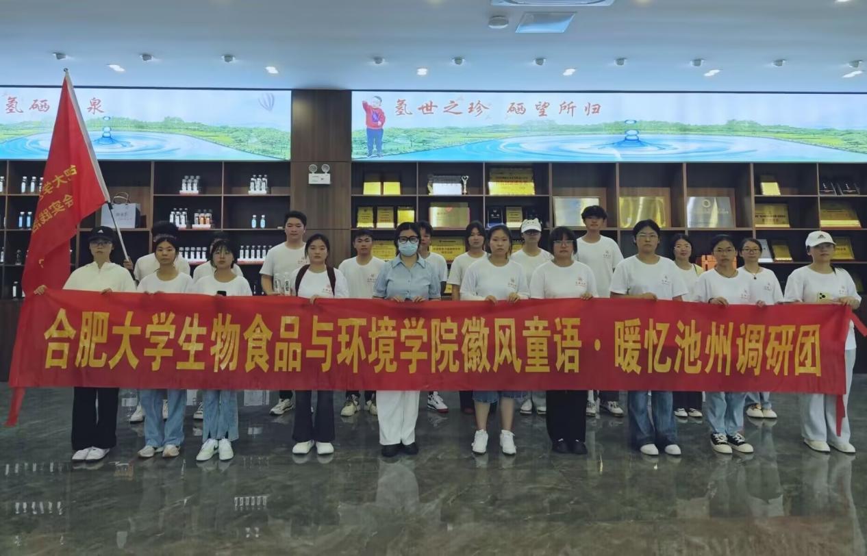 图为调研团成员与安徽氢硒康泉水业有限责任公司讲解员合影留恋