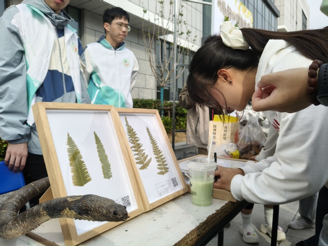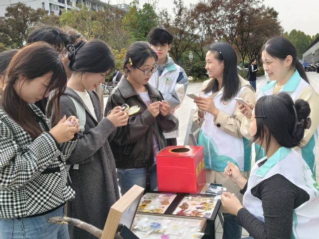 活动现场,一面正在不断“生长”的“叶脉舒心”留言墙成为最大亮点。组织方别出心裁地以天然树叶替代便签纸,邀请同学们执笔,将无人倾诉的烦恼、瞬间的感动或未来的寄语书写其上。五彩的树叶很快贴满了展板,构成一幅承载着集体情绪的温暖画卷。这片小小的留言墙,以其独特的自然柔软之力,成功为同学们开辟了一个安心、匿名的情绪栖息地。毗邻的“健康知识问答”区则充满了思维的碰撞与欢声笑语,活动将“饮食缓解疲劳”、“外卖健康选择”等日常困惑转化为一道道趣味题目,吸引了众多同学挑战。通过回答“哪种污染物会通过食物链影响健康”等问题,抽象的健康知识化为具体的行动指南。答对者不仅能收获小礼品,更收获了赋能日常生活的科学理念,让健康不再是一句空洞的口号。动植物标本展示区,同样人流如织。讲解员立足标本,深入浅出地介绍相关学科在生命健康和环境保护中的前沿应用,引发了同学们的浓厚兴趣与热烈讨论。