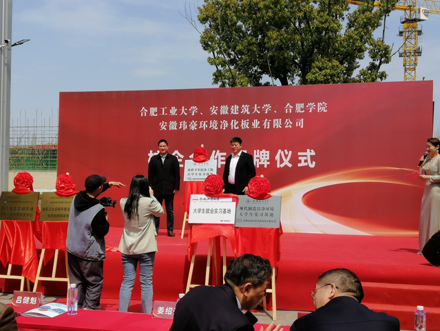 笃行致远,协同发展,为促进产教深度融合,2023 4 8日上午,合肥学院联合合肥工业大学、安徽建筑大学与安徽玮豪环境净化板业有限公司校企合作揭牌仪式在长丰县杨庙镇安徽玮豪厂区隆重举行。仪式现场嘉宾云集,智者如云,合肥工业大学党委常委、副校长季益洪,安徽省农业农村厅乡村产业处一级调研员吕健魁,长丰县副县长安鑫,长丰县杨庙镇党委书记武林以及众多高校领导教授、政府领导、特邀嘉宾等共同见证这一重要时刻。合肥生物食品与环境学院院长阮班锋向安徽玮豪进行了“大学生实习就业基地”的授牌,并合影留念。