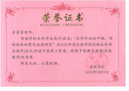 肖青青同志在科研工作方面紧密围绕专业需求和发展,主要从事食品安全与农业环境污染防治等方面的科研工作。主持完成国家自然科学基金青年基金项目1项、国家重点研发计划子课题1项、安徽省自然科学基金青年基金项目1项、合肥市科技局对外合作借转补项目、横向校企合作项目1项、发表论文20篇(SCI论文5篇、中文论文4篇,其中中科院分区大类一区SCI论文2篇、CSCD论文1篇、中文核心期刊论文1篇)。授权实用新型专利5项、软著6项、科技论文获奖1项。