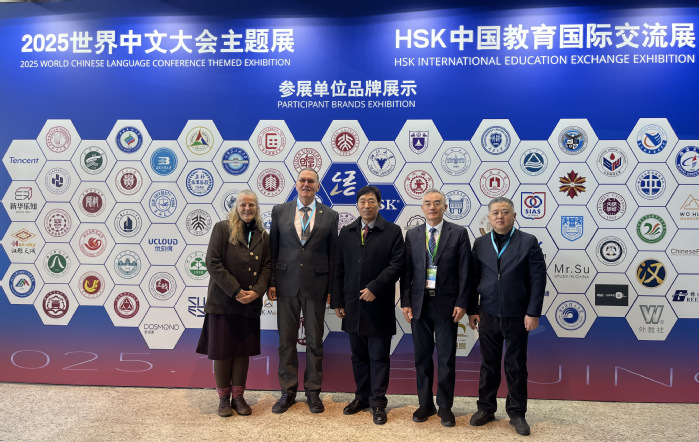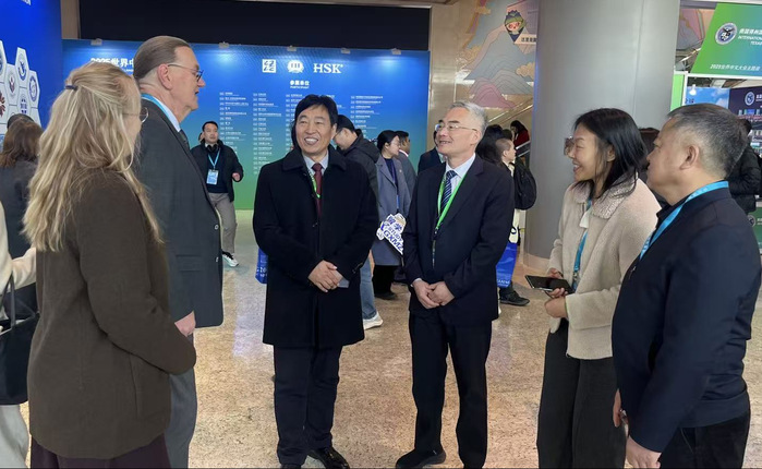 2025世界中文大会由教育部主办,中外语言交流合作中心、中国国际中文教育基金会、世界汉语教学学会共同承办,主题为“创新引领 数智赋能——让中文零距离”。参会期间,邬平川专程拜访教育部语言文字信息管理司、国际合作交流司,会见学校合作建设的德国施特拉尔松德孔子学院德方代表。教育部相关司局负责人充分肯定开云“地方性、应用型、国际化”办学定位,肯定学校在对德合作及中文国际传播中的务实举措,鼓励学校持续创新合作模式,打造国际中文教育与中外合作办学新标杆。施特拉尔松德孔子学院德方代表表示,将以2025世界中文大会主题为指引、孔院建设十周年活动为抓手,强化在德国的中文教学与文化交流纽带作用,深化数智化教学与特色交流活动,全力打造德国标杆孔子学院。
