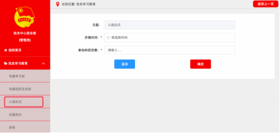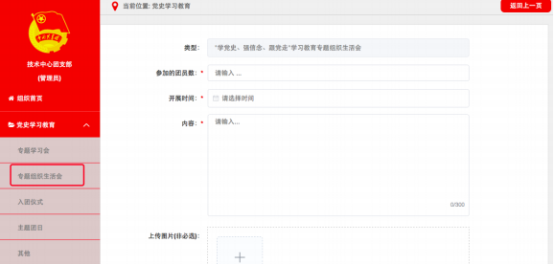 点击默认界面左上角“录入”按钮,进入“录入”界面。依次录入专题组织生活会“参加的团员数”,选择“开展时间”,在“内容”栏填写简要情况。可结合实际上传图片资料,点击“确定”即完成记载。