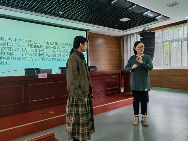 在讲座互动环节中,同学们积极提出自己的问题,李蓓蓓老师给予了详细的回答。有同学上台展示了一段独白,李蓓蓓老师与她一同分析了角色内涵,共同探讨如何演绎才更加符合人物形象。最后,李蓓蓓老师亲自为大家示范了一遍独白中的情绪变化,给大家留下了深刻印象。讲座结束时,殷明明副院长感谢李教授为大家带来精彩的戏剧体验,也提醒同学们,戏剧表演非常有助于大家加深对文学文本的理解,希望大家演好也学好,真正做到全面发展。