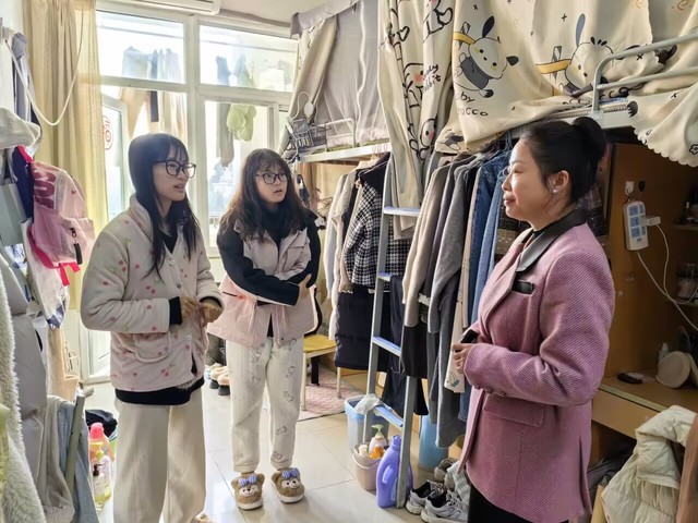 走访过程中,张爱萍书记对宿舍内环境卫生、用电安全等方面进行检查,她强调同学们要增强安全意识,规范用电行为,保持宿舍整洁,共同营造一个安全、整洁、温馨的住宿环境。走访研究生宿舍的过程中,查金萍院长详细询问了研究生的研究方向、学术进展及未来规划,并给予专业性指导与建议,鼓励同学们要勇于创新、敢于挑战,在学术研究中不断追求卓越,做到学有所成、学有所获。