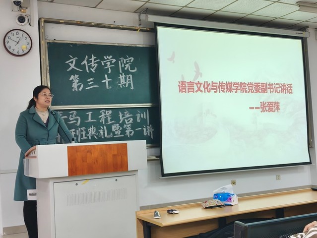 进入第三项议程,语言文化与传媒学院党委副书记张爱萍老师发表讲话。她对现场参加青马团课的同学们表示热烈欢迎,接着张爱萍老师深刻阐释了青马团课对于青年成长和时代发展的重要意义,并提出三点希望:希望同学们珍惜机会,认真学习;积极将理论应用于实践;在接下来的学习中互相帮助,共同进步。