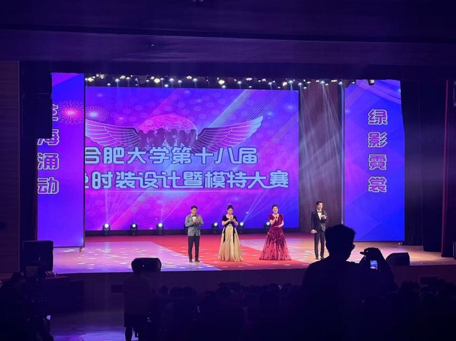 比赛现场,语言文化与传媒学院团队设计出一系列融合传统文化元素的服装。这些服装采用天然材料、可再生资源以及循环再造的理念,探索时尚与生态的平衡之美。从徽派建筑的灵动线条,到徽州三雕的精致纹理;从传统纹样的古朴韵味,到非遗技艺的独特魅力,参赛作品将传统文化与现代环保设计完美结合,让观众耳目一新。值得关注的是,语言文化与传媒学院参赛服装均由设计者亲自动手制作,充分展现了同学们的动手能力和创意潜力。模特们身着这些独具匠心的服装,在T台上自信地展示,配合精心制作的PPT动态背景和伴奏音乐,生动地诠释了每一件作品的设计理念。他们的精彩表现赢得了现场观众的阵阵掌声和欢呼声。