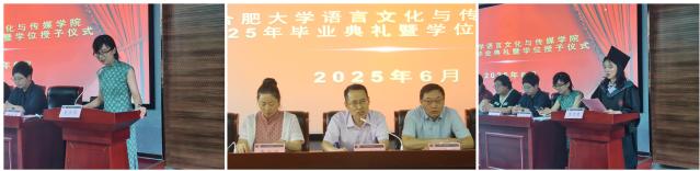 典礼伊始,全体起立,奏唱国歌。随后,主持人介绍了出席的领导与学位委员会成员。紧接着,优秀毕业生代表2021级新闻学(1)班徐萌萌发言。她回溯大学时光,分享成长感悟,感恩学院培育与师长教导,也激励同窗以青春为帆,奔赴广阔未来。随后,教师代表张冰清上台,她回顾了与学生相伴的教学岁月,同时寄语大家坚守初心,在未来以专业学识和进取精神,书写更多精彩。最后,语言文化与传媒学院院长、院学位评定委员会主任丁增武教授寄语毕业生。他梳理学院与学生共同成长的历程,肯定大家在学业、实践中的收获,更鼓励同学们传承学院精神,以担当和热爱,在时代浪潮中勇立潮头,用所学去拥抱机遇、创造价值,为青春上色,为学院添彩。