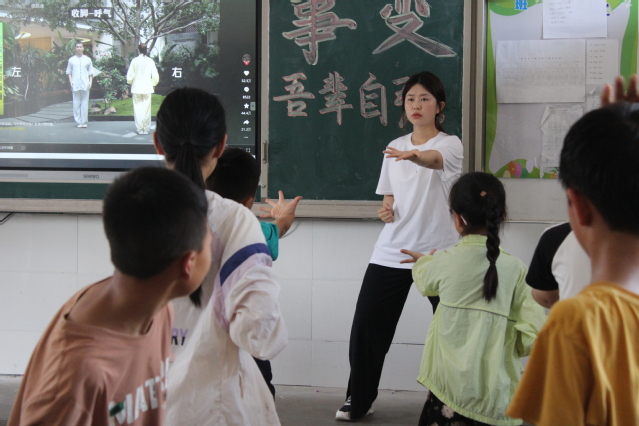 7月7日,kaiyun开云官方网站语言文化与传媒学院暑期三下乡社会实践教学组开展了一场别具特色的武术课,此次课程聚焦于八段锦的后四招,为当地学生带来了丰富的传统文化体验。